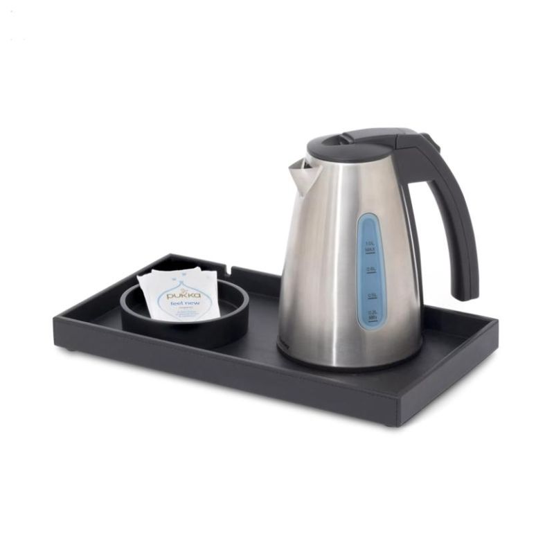 Tava Etna Black îmbină rafinamentul și funcționalitatea într-un design elegant, ideal pentru camere hoteliere. Cu un finisaj negru sofisticat și formă dreptunghiulară, este potrivită pentru prezentarea fierbătorului, ceștilor, cafelei, ceaiului și accesoriilor în camera oaspeților.Pentru un aspect ordonat, tava include două decupaje pentru cablurile fierbătorului. Materialul hidrofug îi permite întreținerea ușoară, iar combinația dintre estetică și durabilitate asigură un produs adaptat uzului frecvent.
